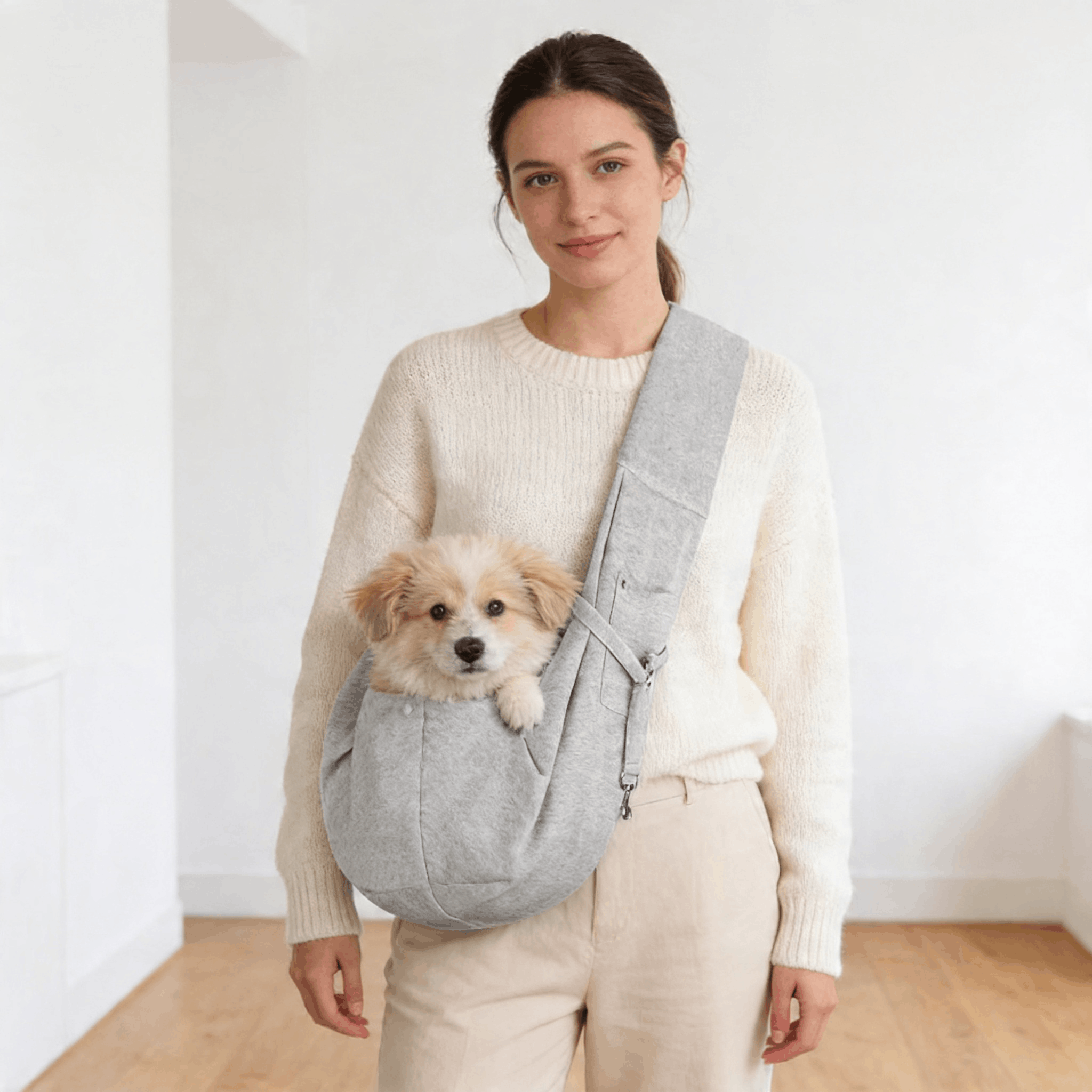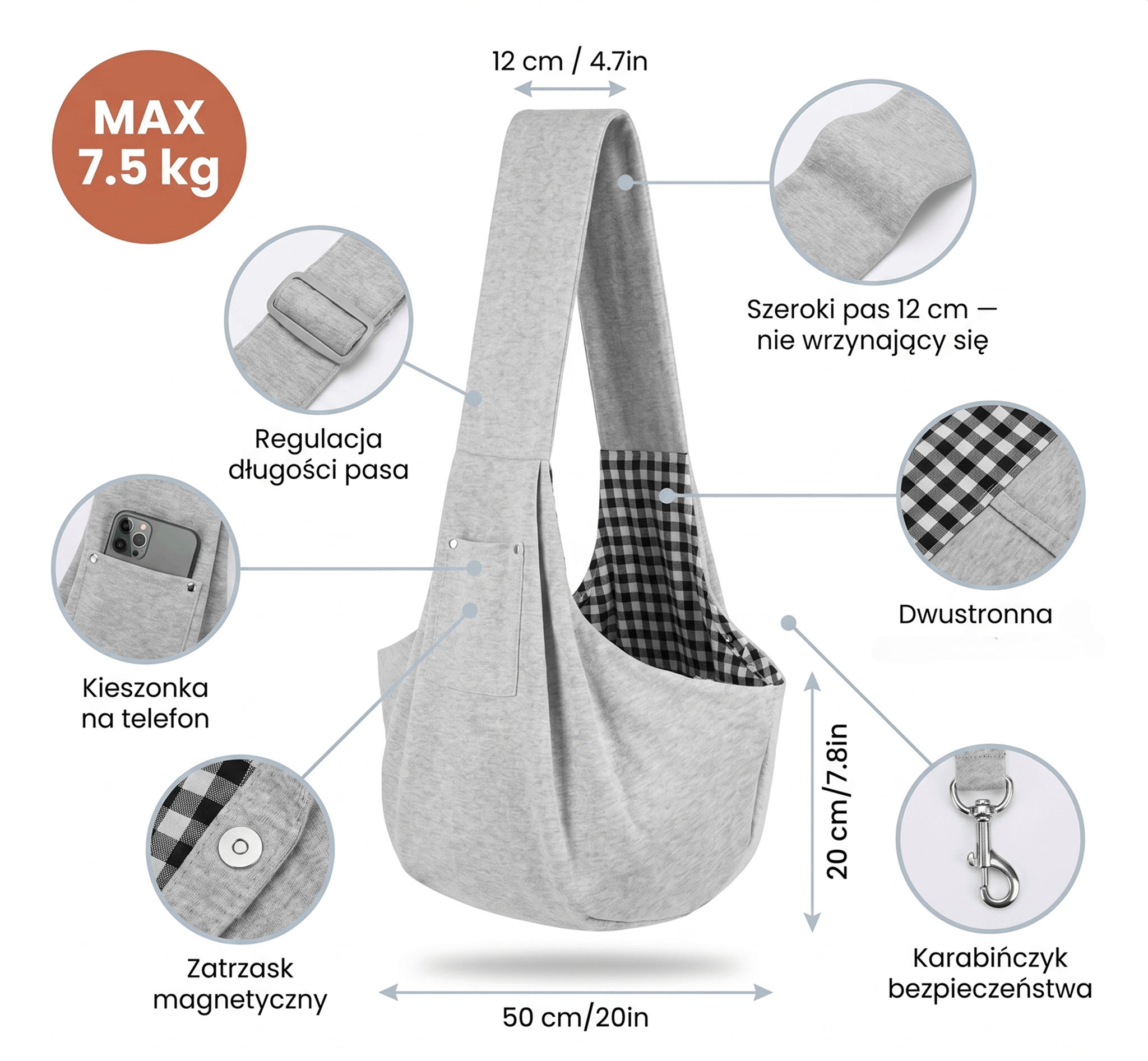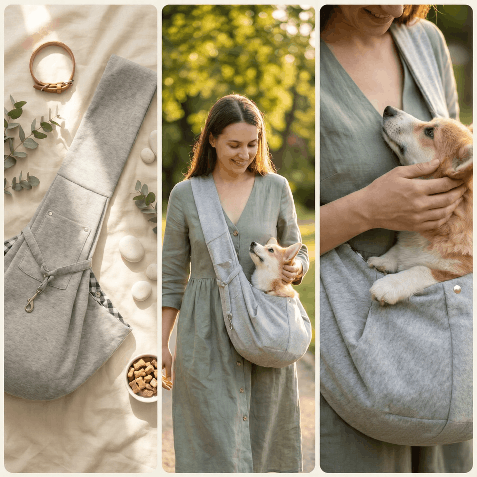 Kieszonka na telefon, klucze i smakołyki. Pas przez ramię, pies przy sercu. Możesz trzymać kawę, robić zakupy, pisać wiadomości. Pies jedzie — Ty żyjesz normalnie.