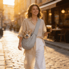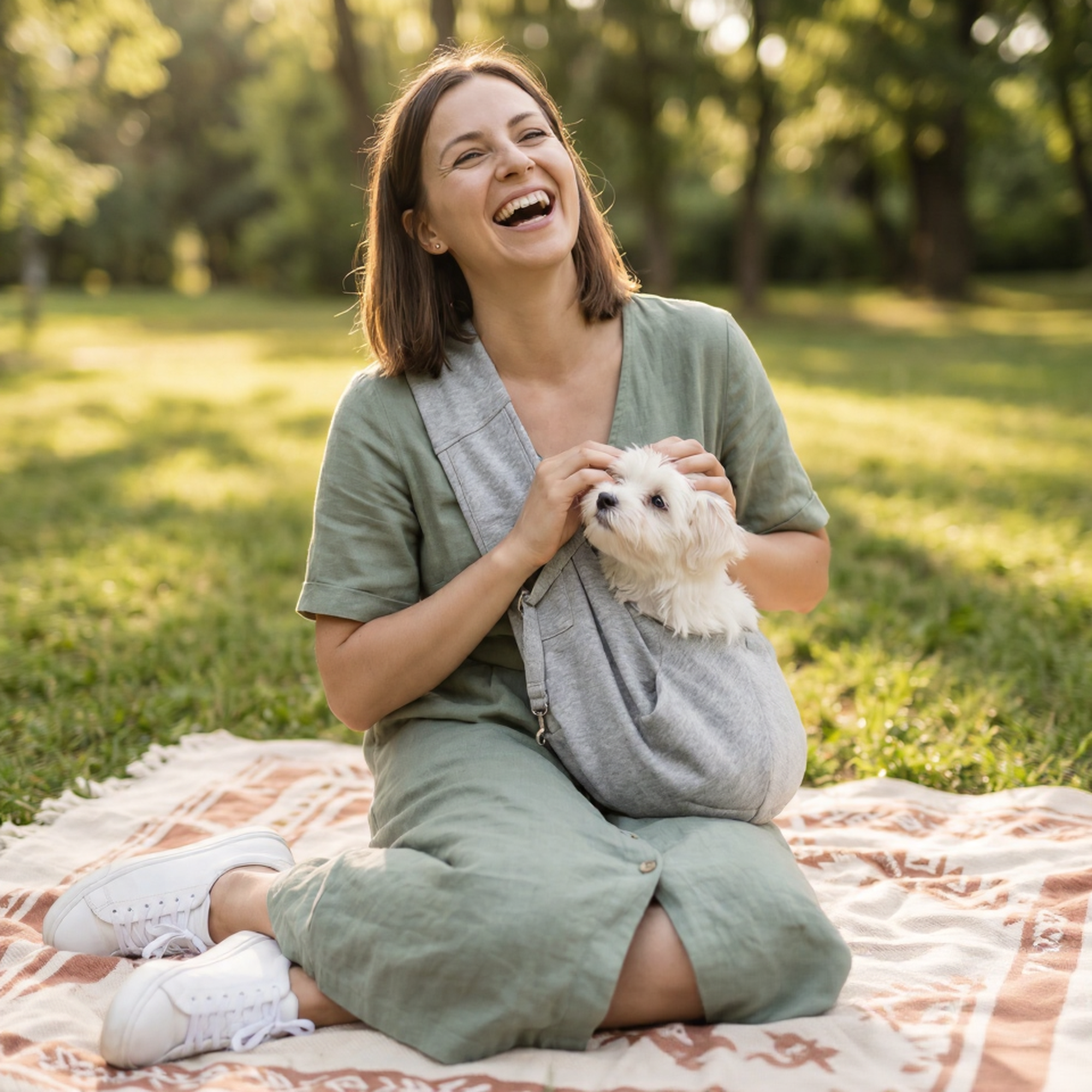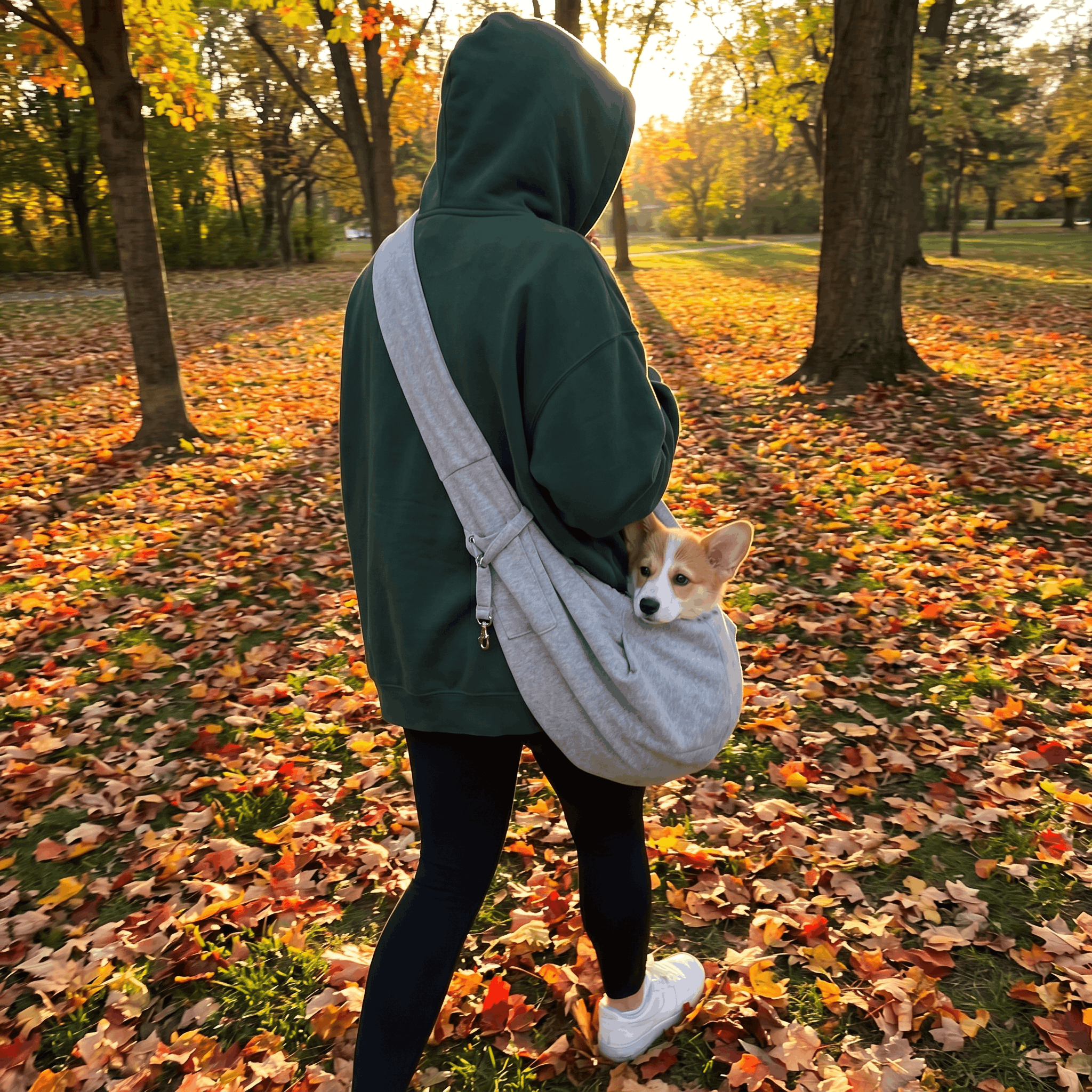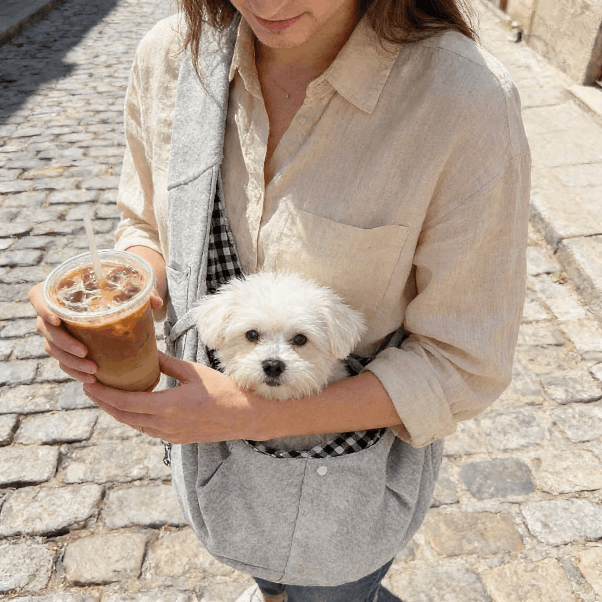 Kieszonka na telefon, klucze i smakołyki. Pas przez ramię, pies przy sercu. Możesz trzymać kawę, robić zakupy, pisać wiadomości. Pies jedzie — Ty żyjesz normalnie.