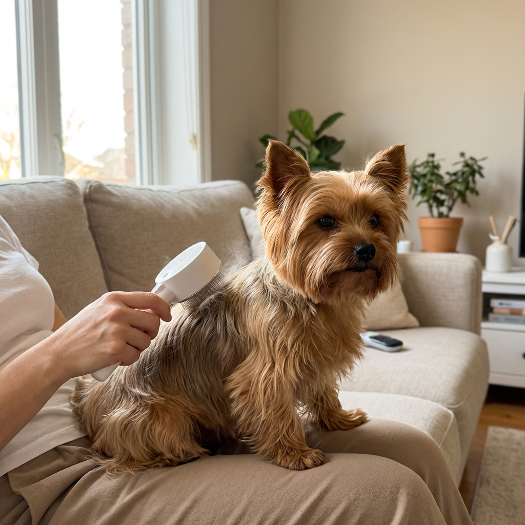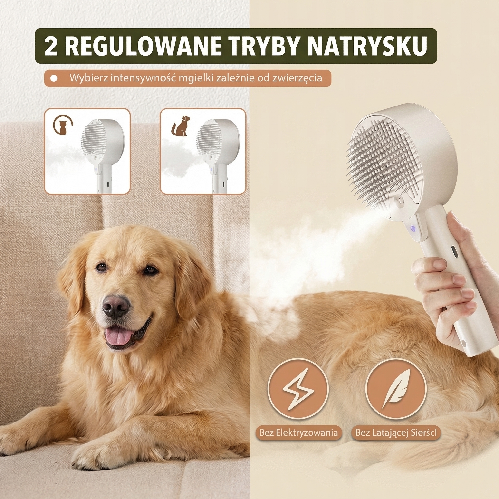 Puchołapka działa odwrotnie: mgiełka wodna trafia na sierść zanim dotkną jej szpilki. Wilgoć neutralizuje elektryzowanie, kołtuny miękną, włosy się rozdzielają. Szczotka przesuwa się swobodnie — bez szarpania, bez bólu.